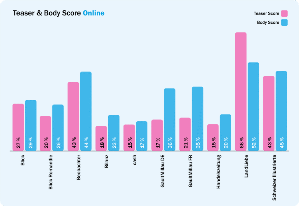 In Switzerland, almost all titles of Ringier Media Switzerland were able to increase their teaser and body visibility in 2025 compared to 2024, both in print and online. The development at GaultMillau was particularly strong, with an online increase of 16.1 percentage points. The overall average of the Body Score is now 36.8 percent (print) and 33 percent (online), respectively. Schweizer LandLiebe sets a clear internal benchmark here with 52 percent (online).