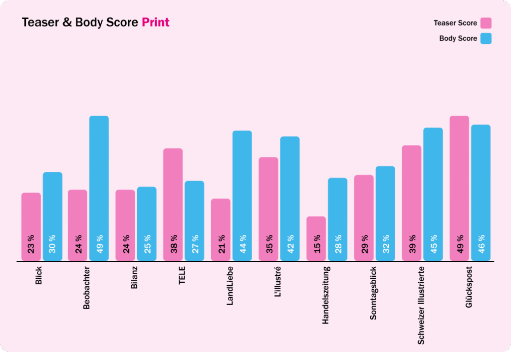 New peaks are also being reached in headline visibility, the Teaser Score: Schweizer LandLiebe leads with a clear 66 percent, followed by GlücksPost print (49 percent), Beobachter (43 percent), and Schweizer Illustrierte (43 percent online / 39 percent print). The prominent placement of female voices is increasingly becoming an editorial standard. Blick has an online Teaser Score of 27 percent (print: 23 percent), thus remaining at a solid level.