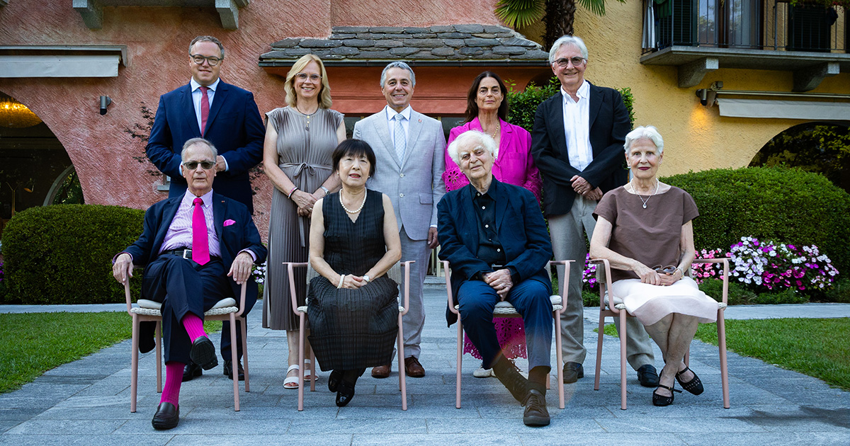 In the picture, seated from left to right: host Frank A. Meyer, Atzuko Muschg, award winner Adolf Muschg, host Lilith Frey. Standing, from left to right: Mario Voigt, Minister President of Thuringia, Andrea Lindholz, Vice President of the German Bundestag, Ignazio Cassis, Swiss Federal Councillor, Maja Hoffmann, President of the Locarno Film Festival, Andreas Isenschmid, publicist and literary critic.